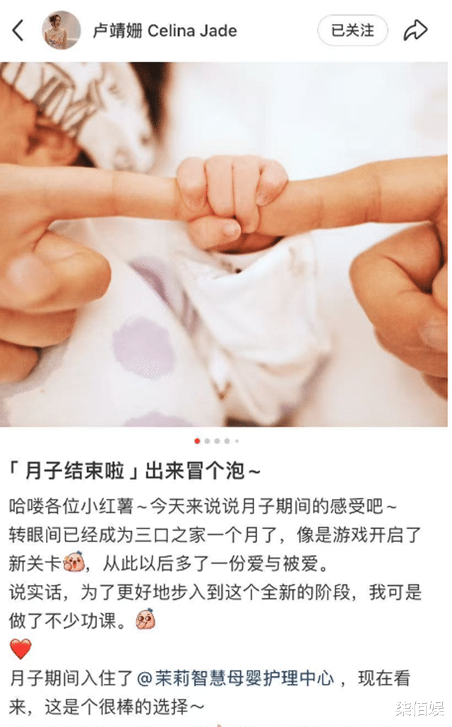 而转眼都半个月了还没等来夫妻俩喜讯,不过,有网友注意到北京的一家月子中心在最新动态中发文称生完二胎的卢靖姗会在这里坐月子,不禁令人猜测卢靖姗已经生产完。