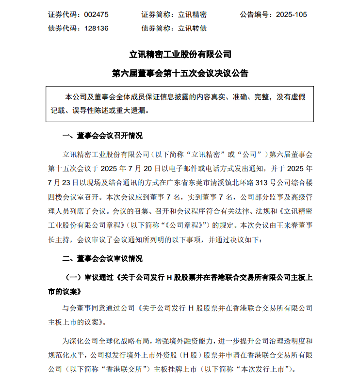 7月23日晚间,立讯精密发布第六届董事会第十五次会议决议公告称,董事会会议审议通过《关于公司发行H股股票并在香港联合交易所有限公司主板上市的议案》。公司拟发行境外上市外资股(H股)股票并申请在香港联合交易所主板挂牌上市,以深化全球化战略布局,增强境外融资能力,提升公司治理透明度和规范化水平。